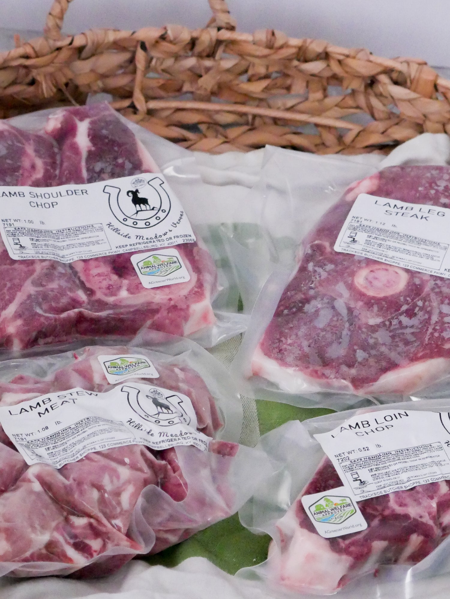 Because our sheep are a Katahdin breed and spend most of their time grazing, our lamb meat does not have a strong mutton taste. Try out our 1" Leg Steaks, Stew Meat, 2" Shoulder Chops, and more!