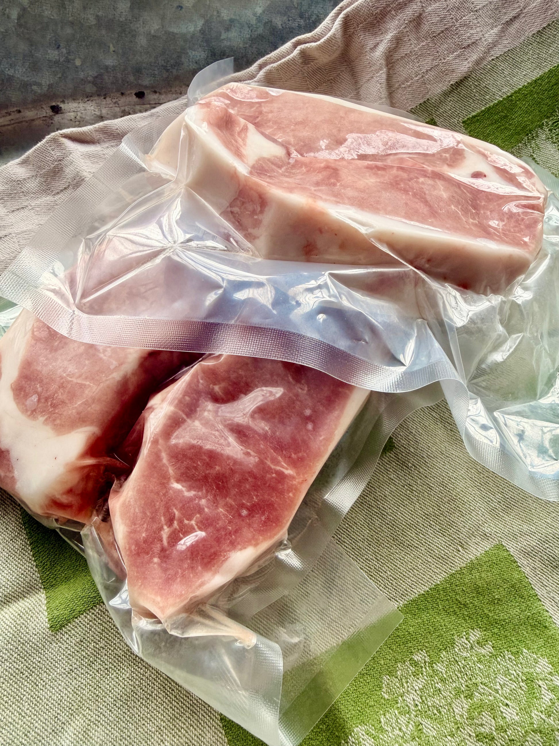Pork chops are perhaps the most valued cut of pork (following bacon of course), and for good reason. They're the ideal cut, soft with a wonderful flavor. Our pigs are 100% pasture raised, roaming over the hills and working their muscles, giving the meat a more complex taste. Having a heavy German influence in our household, we love this cut for schnitzel or a creamy garlic porkchop dinner.