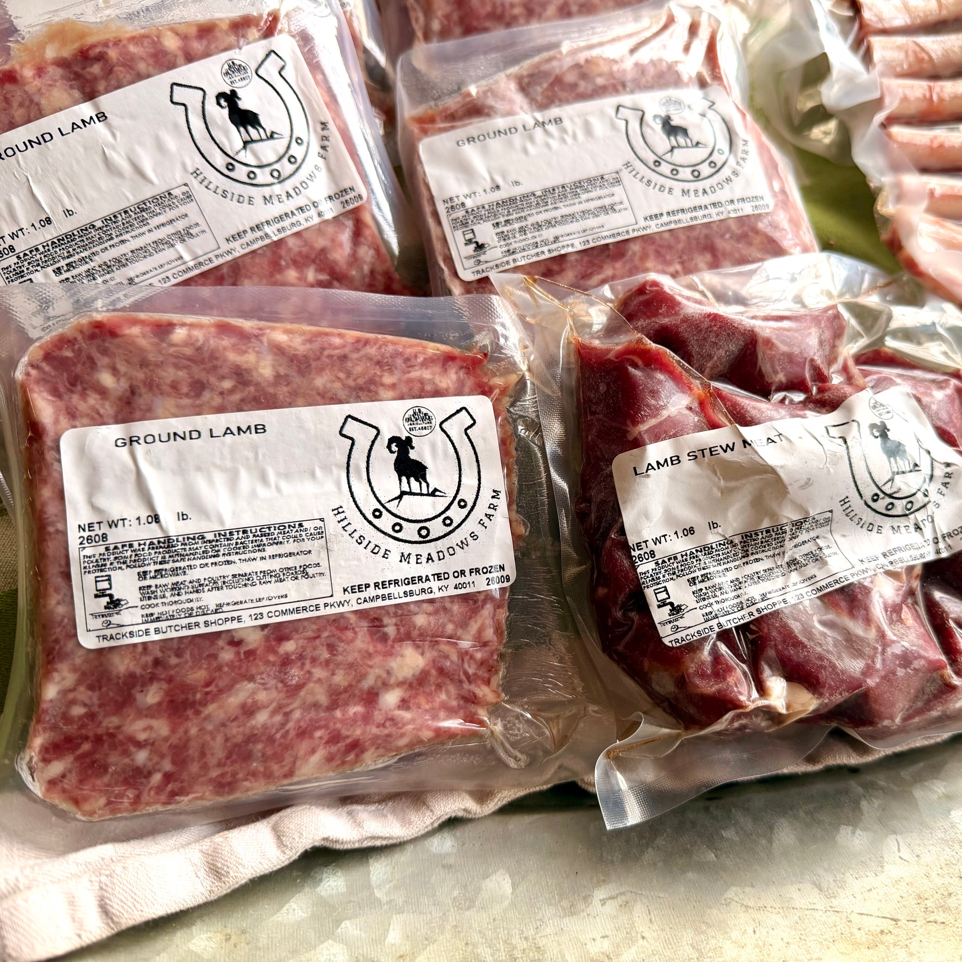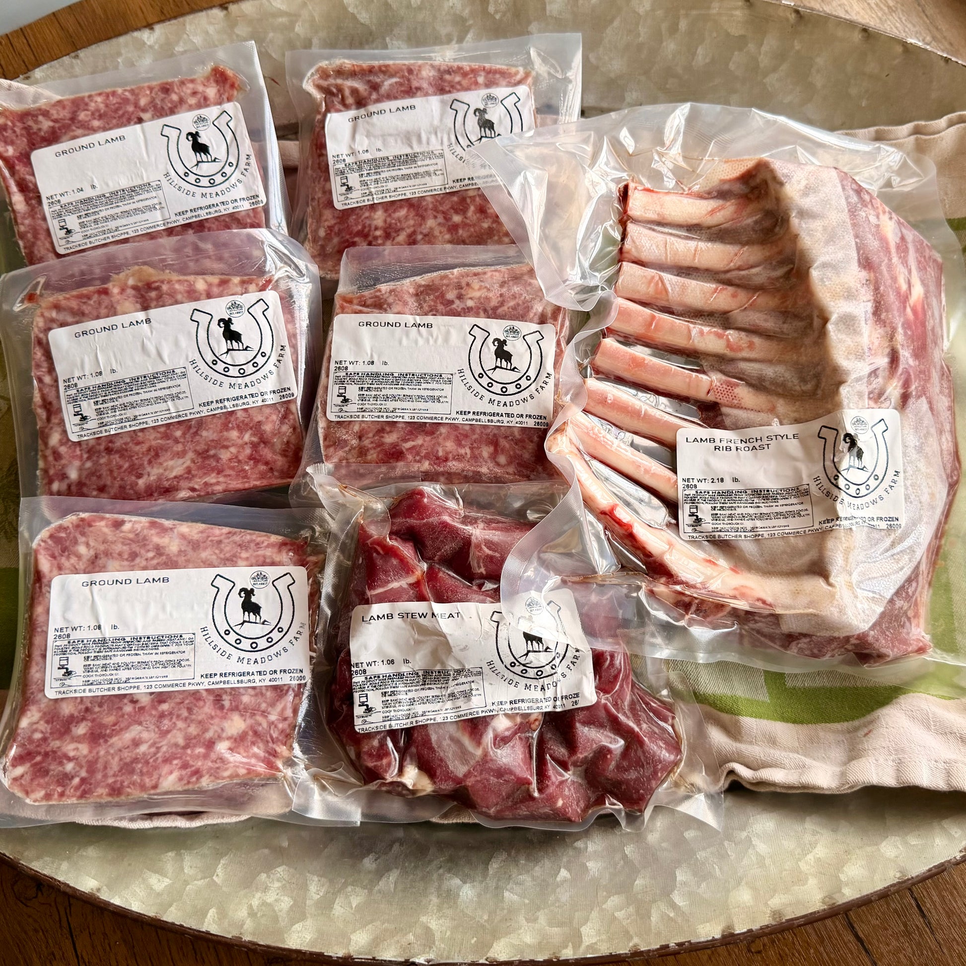 You will receive: one French rib roast, one pack of stew meat, and 5lbs. of ground lamb.