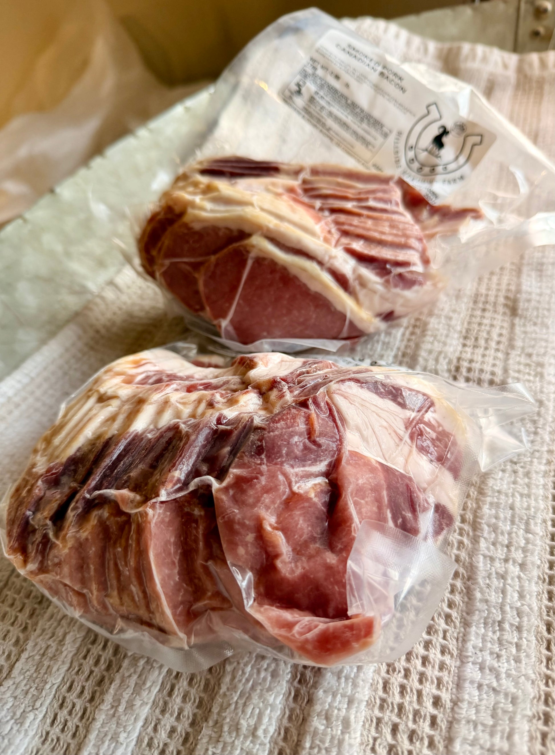 Packaging: bacon is sliced into 1 lb. packs each. Cuts arrive frozen.